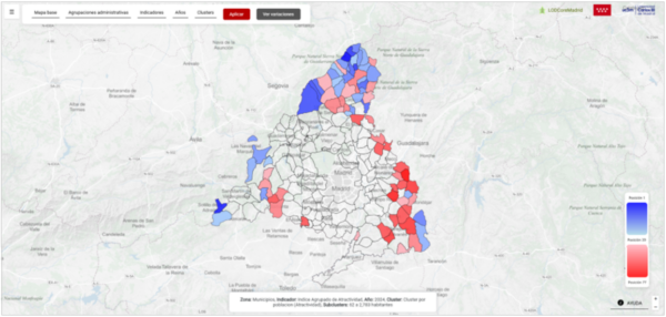 Por ello, el índice de atractividad se calculó para distintos niveles de análisis: por clúster poblacional, por zonas estadísticas y para el conjunto de los municipios de la Comunidad de Madrid. Al analizar los resultados a escala regional, se observó que la comparación directa entre municipios no resultaba adecuada, ya que los rankings mezclaban municipios con capacidades muy diferentes para ofrecer servicios, empleo y conectividad, lo que dificulta una comparación directa.
