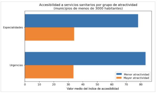 Y en este otro gráfico se comparan los niveles de accesibilidad a servicios sanitarios especializados y de urgencias entre municipios pequeños con mayor y menor atractividad. Los resultados muestran que los municipios más atractivos presentan un menor valor medio de accesibilidad a estos servicios, mientras que en los municipios menos atractivos muestran un mayor valor, esto es correcto dado que el valor medio del índice se mide en tiempo, por lo tanto a menor tiempo mejor. Esta diferencia es especialmente relevante en contextos rurales, donde la población suele presentar una mayor proporción de personas mayores y familias que requieren atención sanitaria frecuente.
