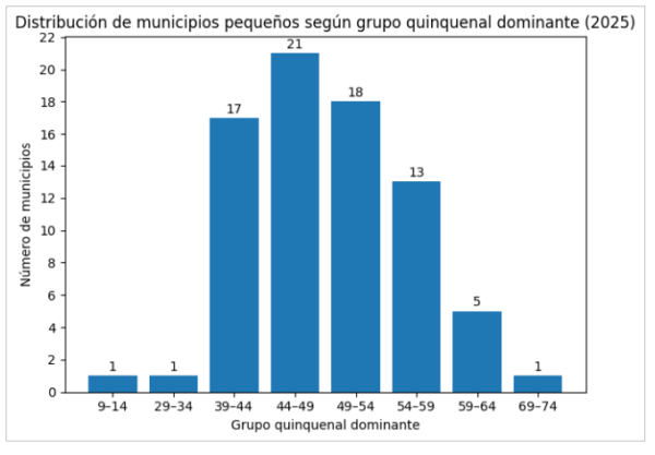 Según datos del Instituto Nacional de Estadística (INE), la estructura demográfica de los municipios pequeños muestra una clara concentración en edades adultas medias. El grupo quinquenal dominante más frecuente es el intervalo 44–49 años (21 municipios), seguido de 49–54 (18) y 39–44 (17). En menor medida aparecen grupos más envejecidos como 54–59 o 59–64, mientras que los tramos jóvenes son prácticamente residuales. Este patrón confirma una estructura demográfica madura y un menor peso relativo de las cohortes infantiles y juveniles.