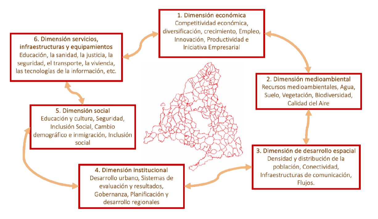 Los indicadores disponibles en el end-point sirven como base para el diseño de una metodología de medición de la cohesión territorial que incluye las siguientes dimensiones: